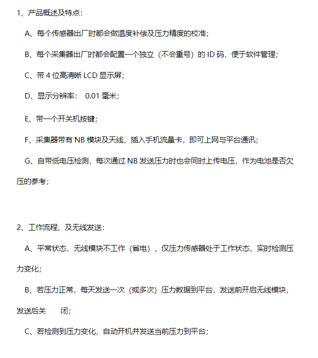 TK83G80K5T5消防水位无线压力采集器、主要用于有消防水池或水箱的地方,检测消防水位的变化,可实现无人监控自动采集压力数据,自动传送数据。借助消防物联网云平台及手机APP的配套软件,可显示、记录、保存数据,压力异常实时报警。该款水池液位表,采用高精度高稳定性隔离膜扩散硅压力传感器做为采集器的感压芯片,带高精度AD的微处理器,先进的贴片工艺,通过NB无线网络传输传数据, 实现无线监控。自带LCD液晶显示屏及开机按钮,方便现场随时观测压力。